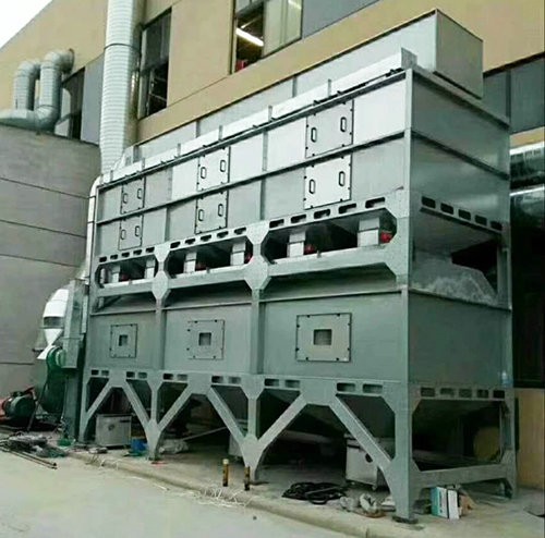 在化學(xué)反應(yīng)過程中,利用催化劑降低燃燒溫度,加速有毒有害氣體完全氧化的方法,叫做催化燃燒法。由于催化劑的載體是由多孔材料制作的,具有較大的比表面積和合適的孔徑,當(dāng)加熱到300~450℃的有機(jī)氣體通過催化層時(shí),氧和有機(jī)氣體被吸附在多孔材料表層的催化劑上,增加了氧和有機(jī)氣體接觸碰撞的機(jī)會,提高了活性,使有機(jī)氣體與氧產(chǎn)生劇烈的化學(xué)反應(yīng)而生成CO2和H2O,同時(shí)產(chǎn)生熱量,從而使得有機(jī)氣體變成無毒無害氣體。